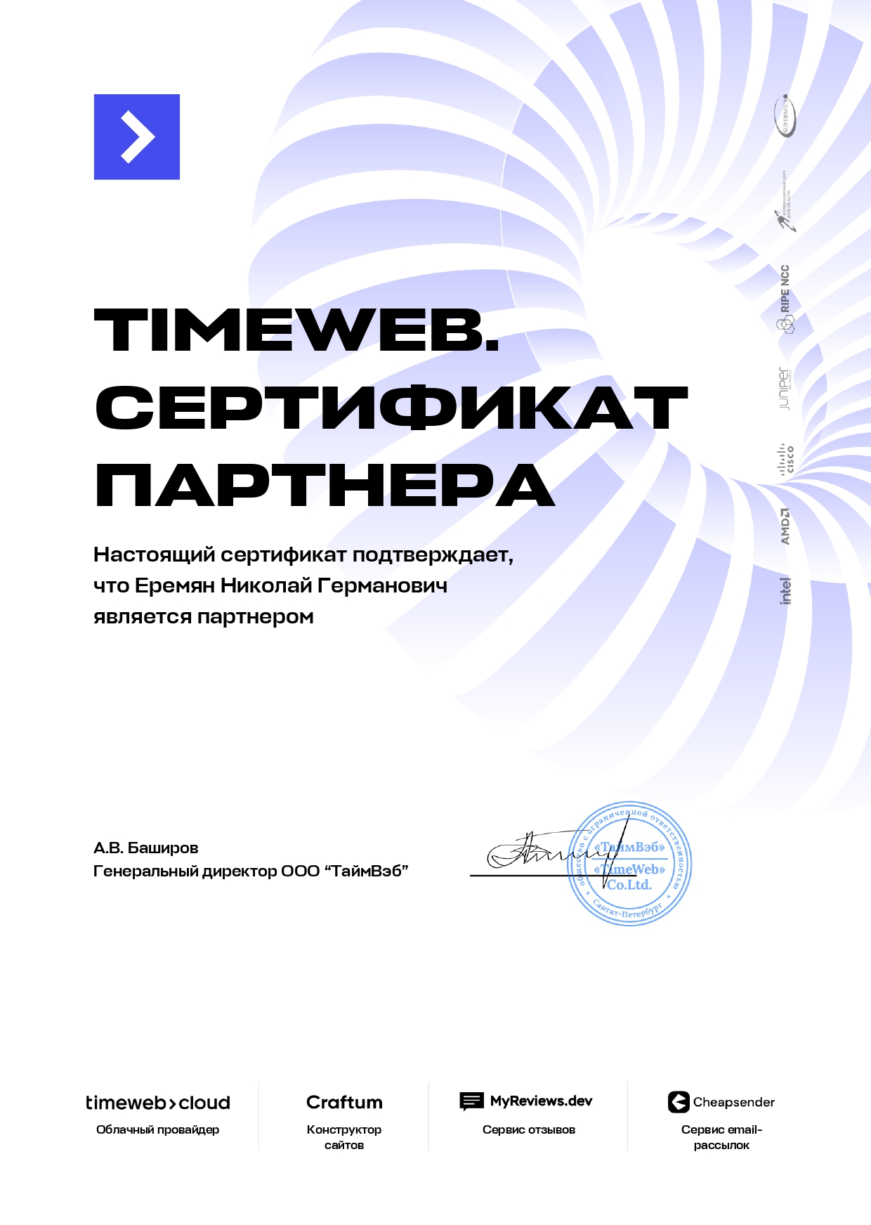 Часто работаю с клиентами, у которых еще не было сайта, домена, хостинга, ничего. Помогаю с нуля и быстро, разработать и запустить сайт (под ключ), своевременно вношу нужные правки и доработки, отслеживаю обновления и работоспособность сайта, делаю резервные копиии, консультирую по любым вопросам.